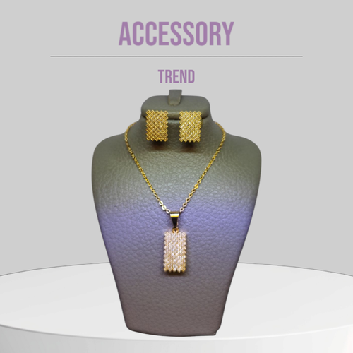 ست زیورآلات لوکس شامل یک گردنبند و یک جفت گوشواره با طراحی مدرن و درخشان، مناسب برای مجالس، مهمانی ها و استفاده روزمره.